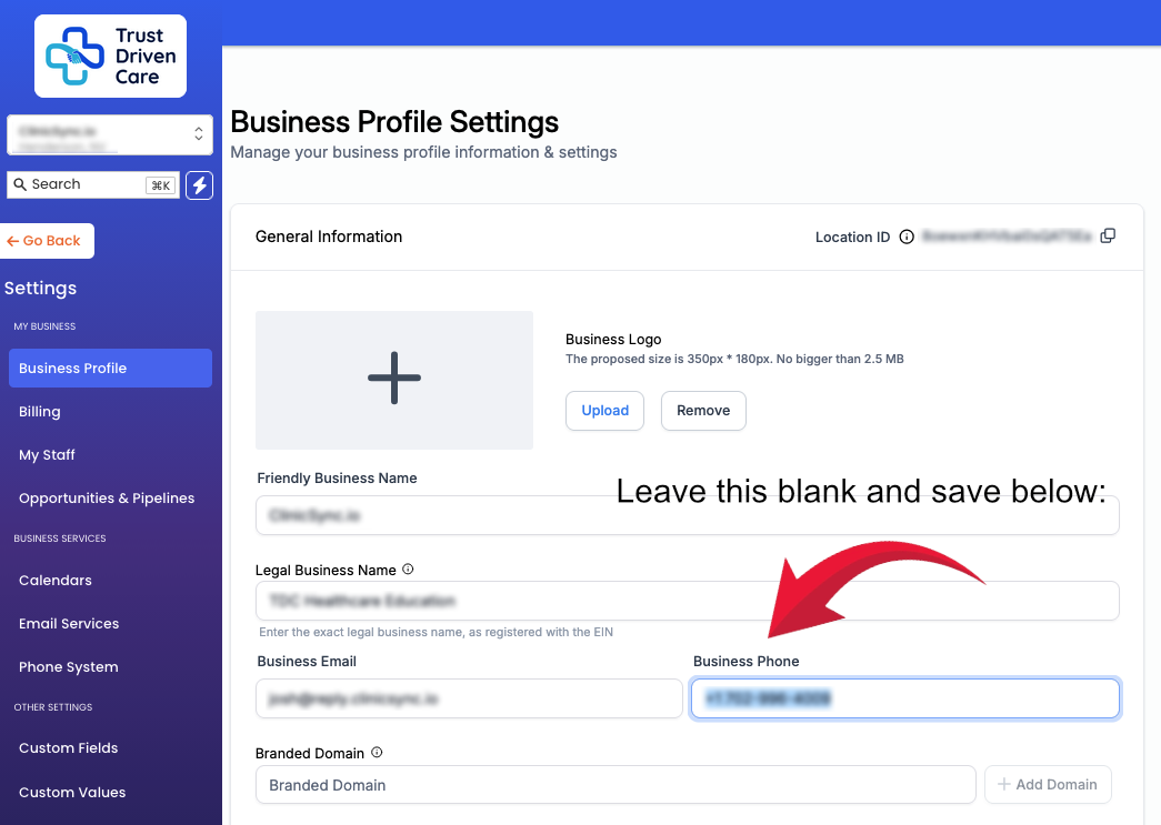 - DELETE the phone number in this box so it is empty.